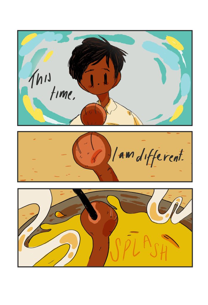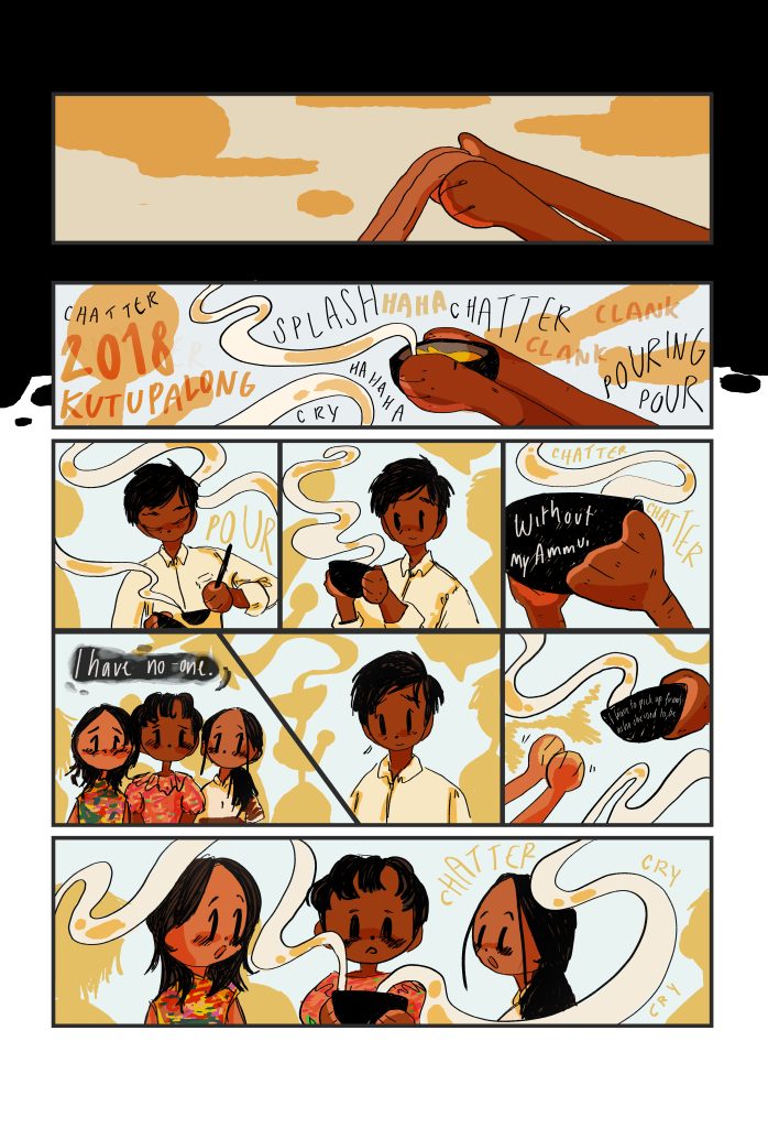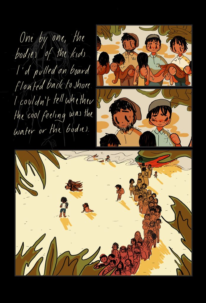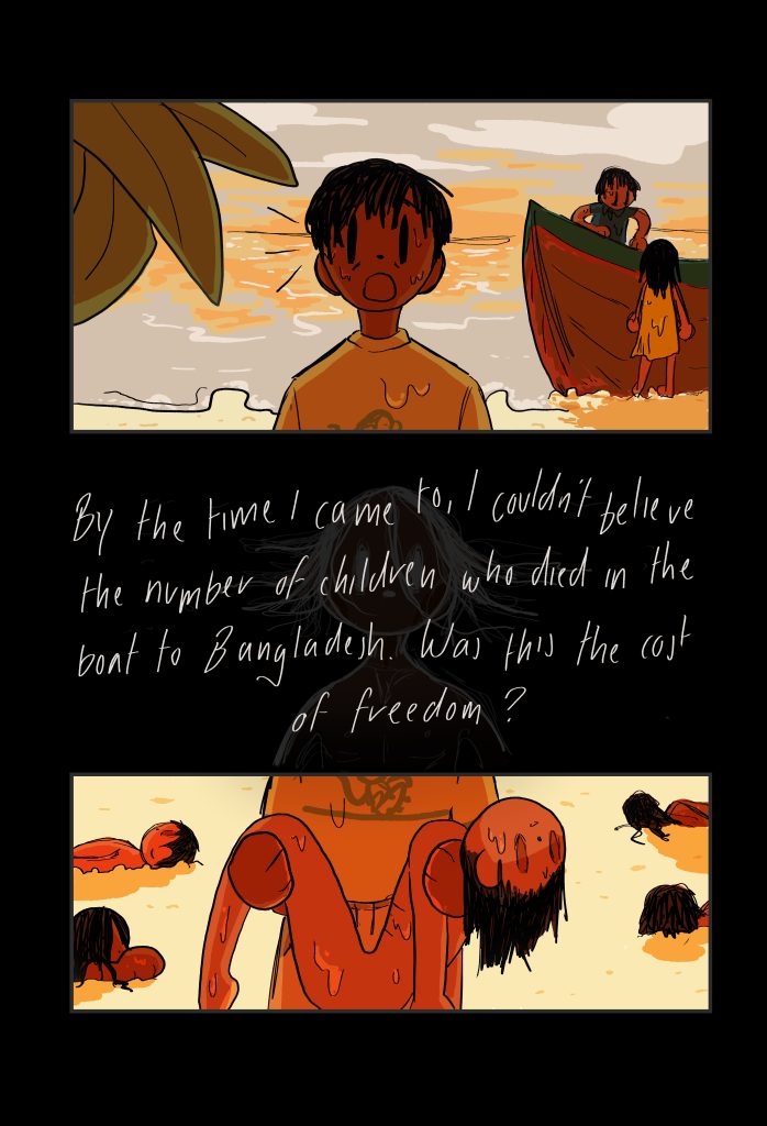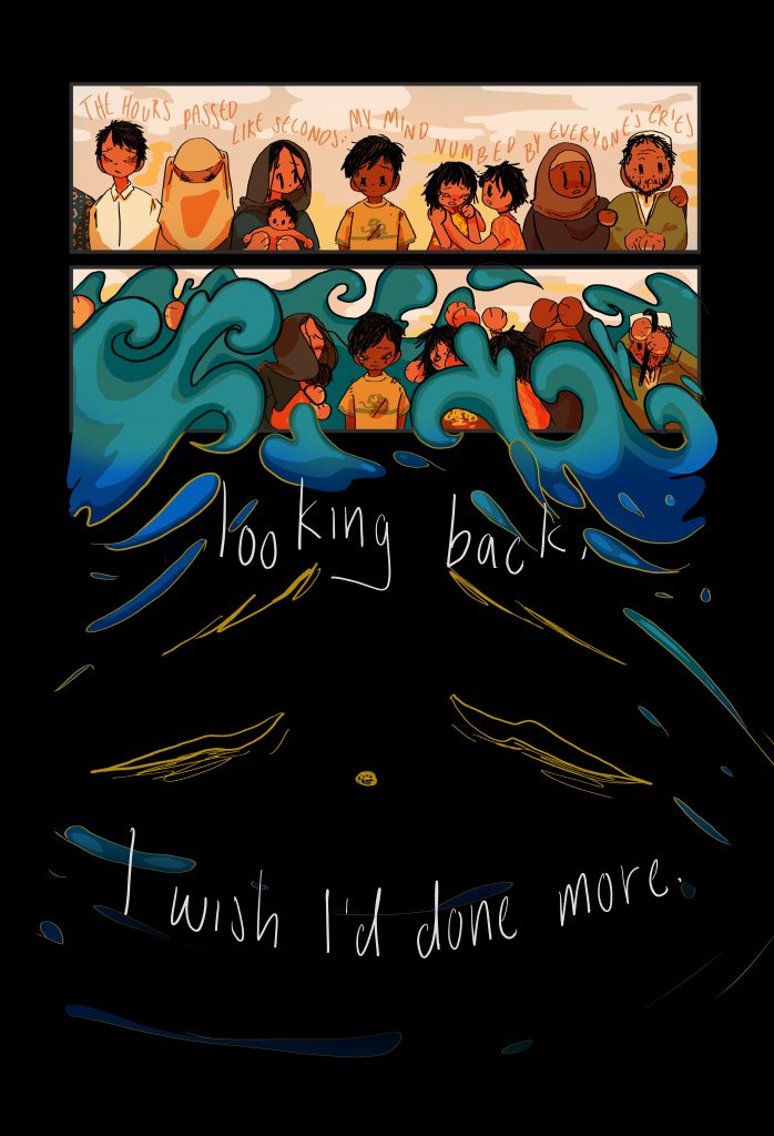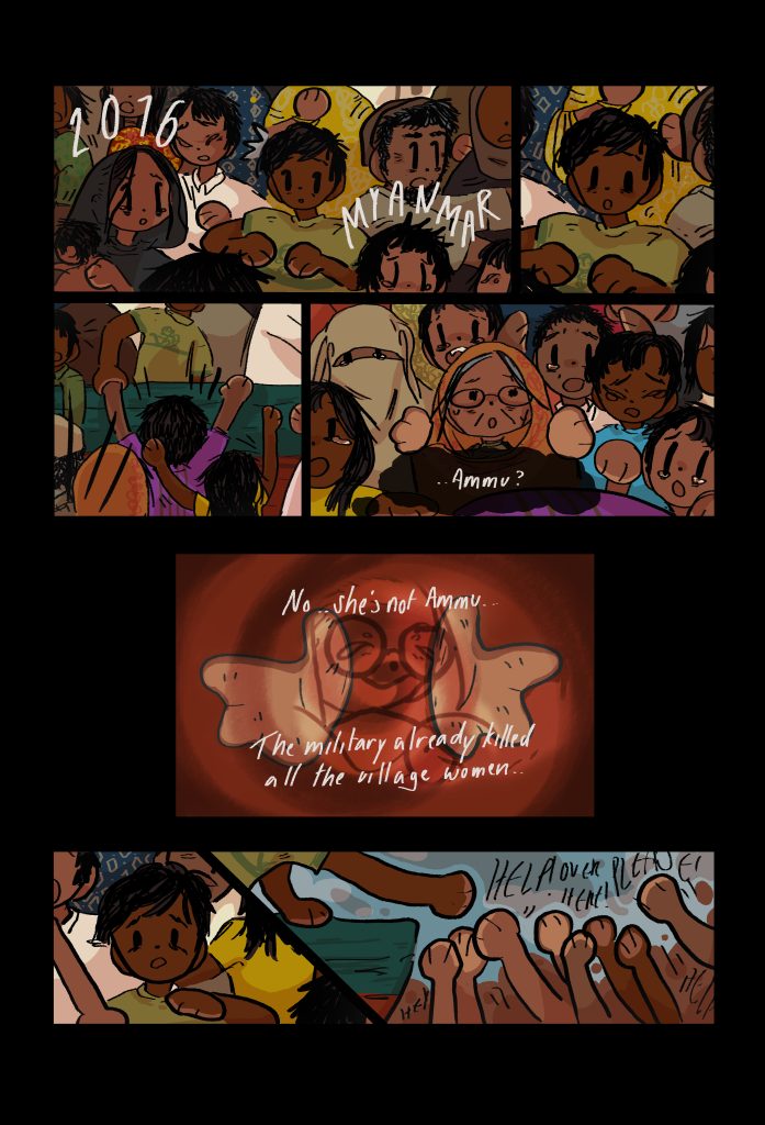 The genocide has been targeting the Rohingya people within Myanmar. It has been caused by propaganda, fueled by worldwide Islamaphobia and historic Islamic-Buddhist conflicts. Since the first phase of the genocide (October 2016), Myanmar experienced an exodus of the Rohingya to Bangladesh, solidifying initial prejudices of their supposed ‘origin’. This comic focuses on a teen boy navigating the loss of his mother as he recounts the treacherous journey to perceived freedom in Bangladesh.